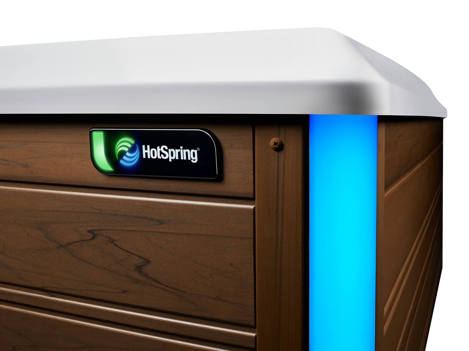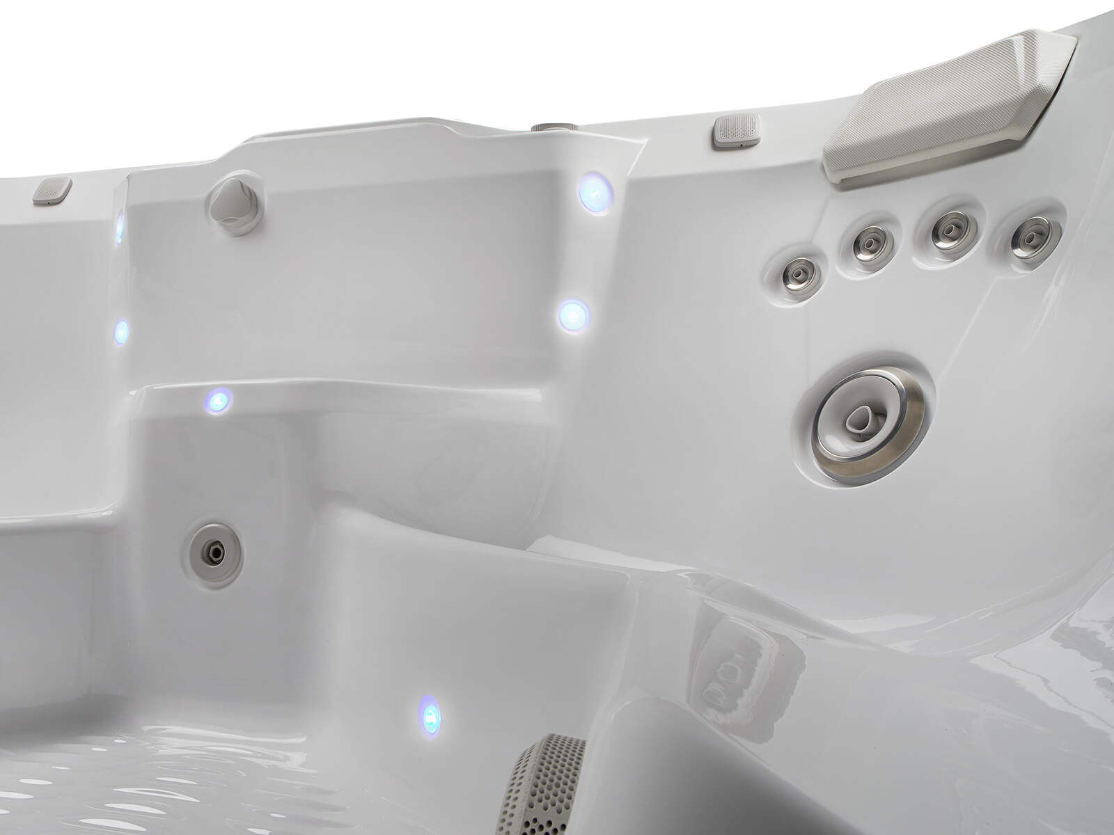 The interior lighting system features multiple points of LED light that accent the contours of the spa shell. Two exterior LED lights integrate with the front corners of the spa, creating an elegant look.