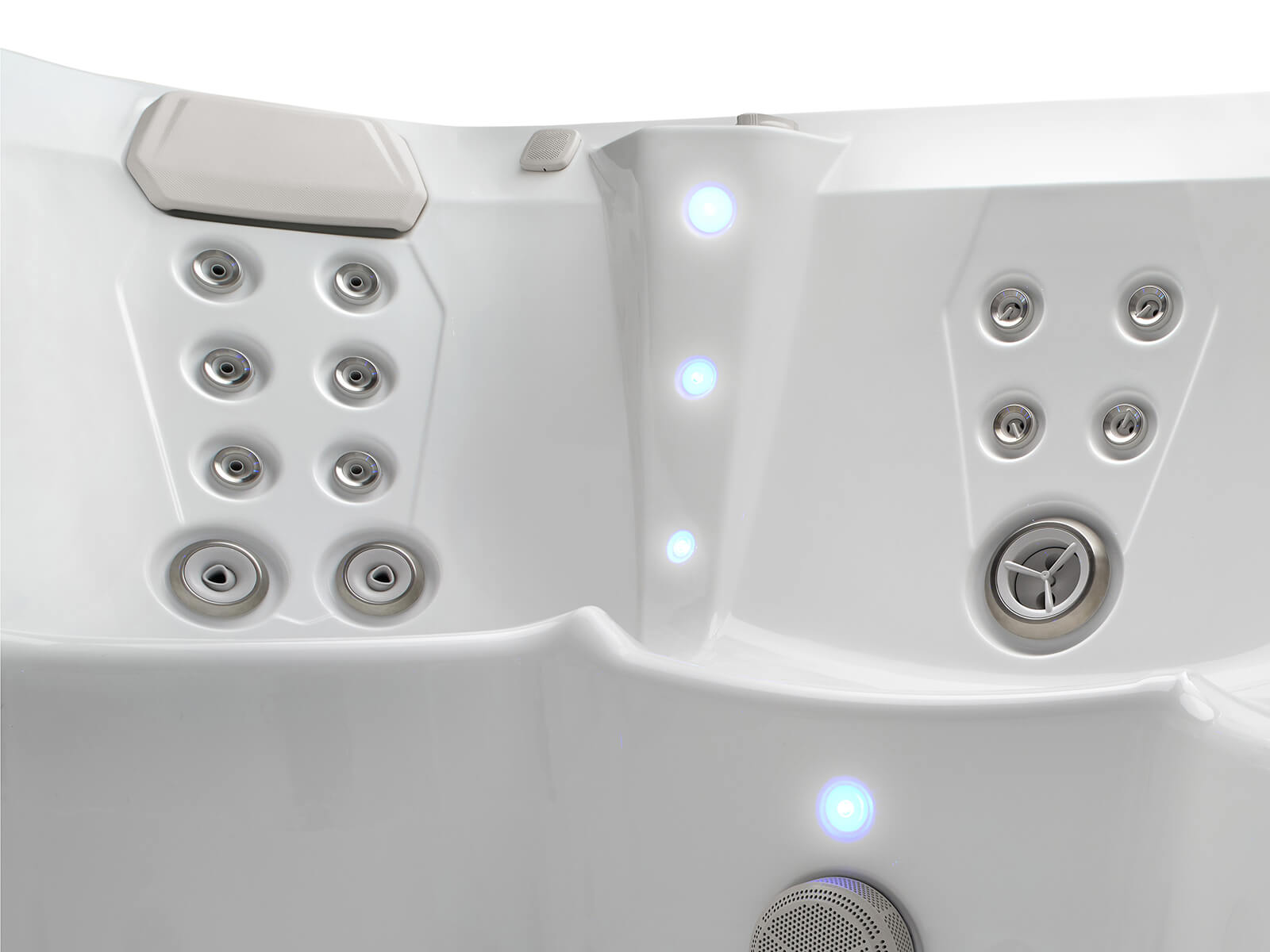 The interior lighting system features multiple points of LED light that accent the contours of the spa shell. Two exterior LED lights integrate with the front corners of the spa, creating an elegant look.